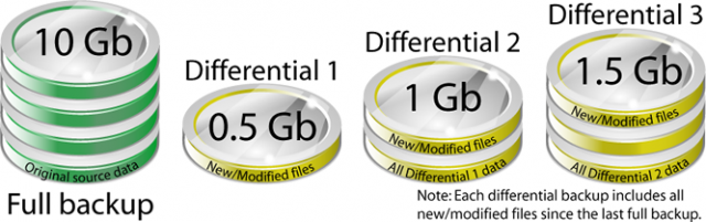 - Sauvegarde différentielle : permet, comme la sauvegarde incrémentale, de sauvegarder uniquement les données qui ont été modifiées ou ajoutées depuis le dernier backup complet. La restauration est rapide mais ce type de sauvegarde a besoin de plus d’espace que l’incrémentale.