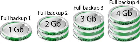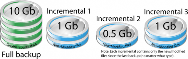 - Sauvegarde incrémentale : permet de sauvegarder uniquement les données qui ont été modifiées ou ajoutées par rapport au dernier backup (qu'il soit complet, différentiel ou incrémental). C’est ce qui est souvent utilisé dans la sauvegarde en ligne. Elle est plus longue à restaurer mais plus rapide à sauvegarder et prend moins de volume (Go).